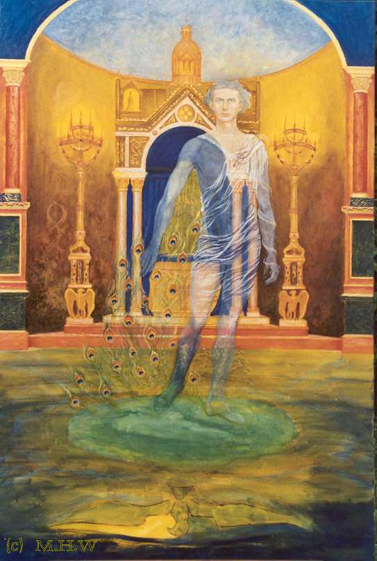 Es zeigt Ludwig II. als mystische Gestalt im Hauptsaal von Schloß Falkenstein, sich erhebend aus dem im Fußbodenmosaik gestalteten Pfau. In der Mysteriensprache der alten Kulturen galt der Pfau als Symbol der Auferstehung. Wer den „Pfauenstatus" erreicht, hat Unsterblichkeit erlangt.